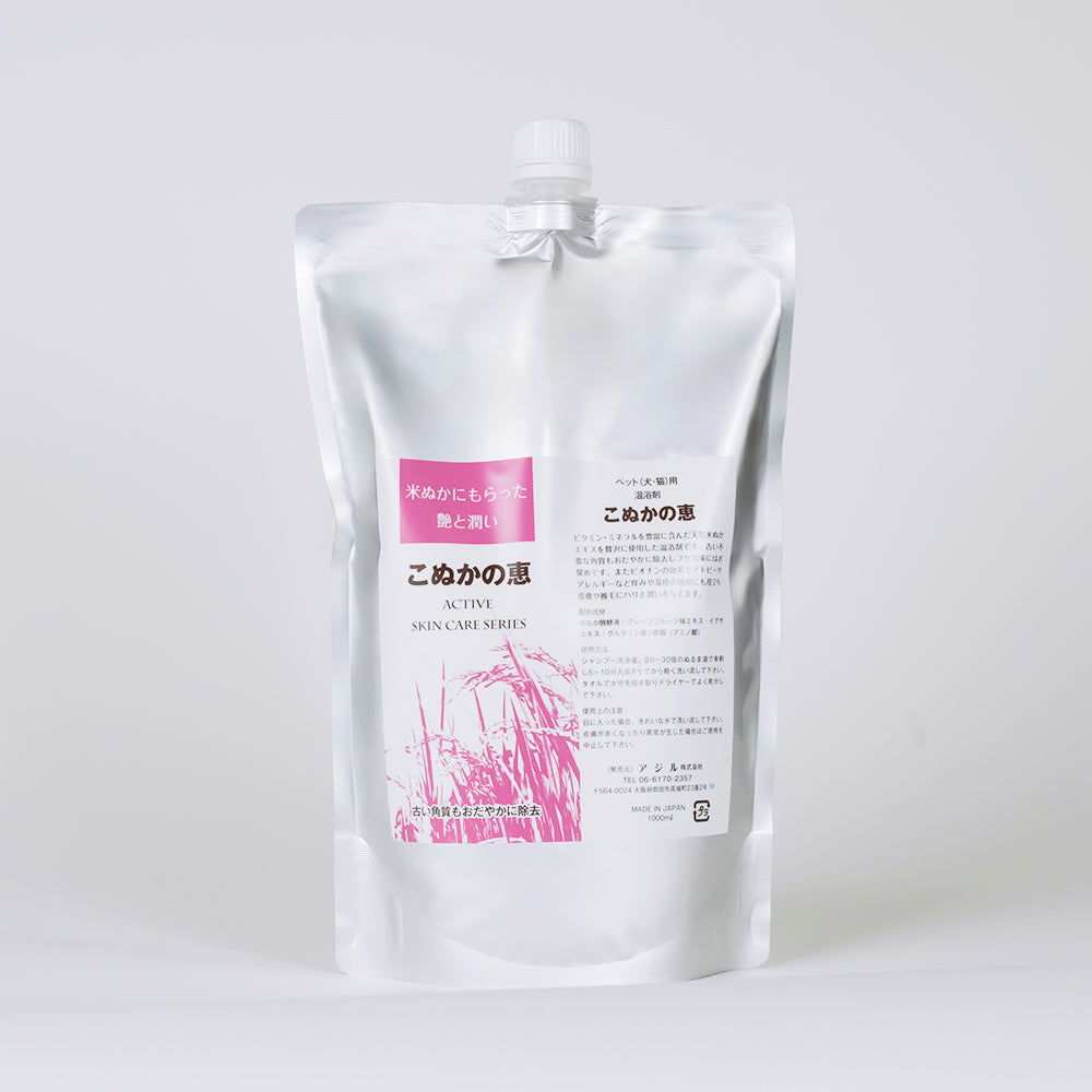 ビタミン・ミネラルを豊富に含んだ天然米ぬかエキスを贅沢に使用した温浴剤です。古い不要な角質もおだやかに除去しフケ対策にはお奨めです。またビオチンの効果でアトピーやアレルギーなど痒みや湿疹の緩和にも役立ち皮膚や被毛にハリと潤いを与えます。